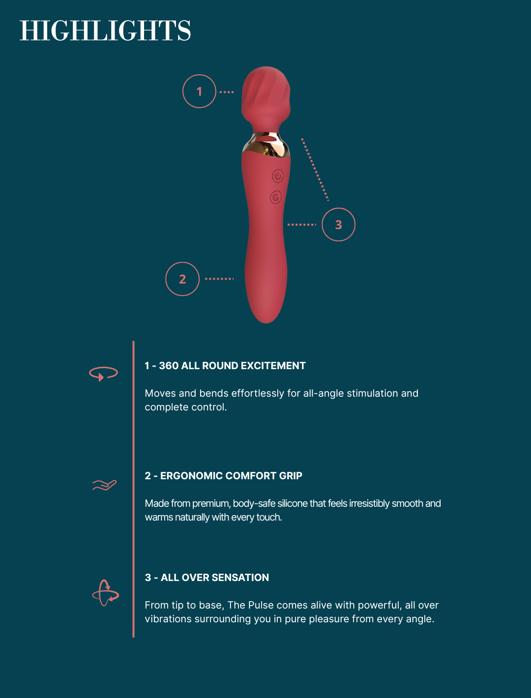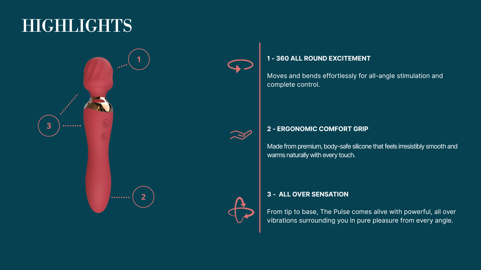 The Pulse is the ultimate luxury wand, designed for complete, immersive pleasure. Unlike ordinary wands, every part including the handle vibrates, delivering deep, resonant sensations across the body. Its dual-ended design allows for insertion with either side, offering flexible and personalized experiences.